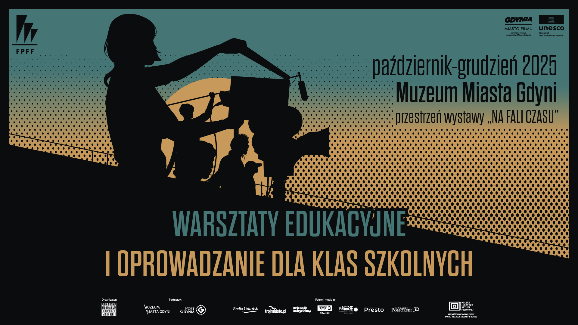 Jak wygląda filmowy festiwal od kulis? Kto decyduje o tym, który film zdobędzie Złote Lwy? Czy kino może mówić o wolności i czy zawsze mogło? Dzieci i młodzież ze szkół podstawowych i ponadpodstawowych zapraszamy na warsztaty edukacyjne towarzyszące wystawie „Na fali czasu” połączone z oprowadzaniem po ekspozycji.